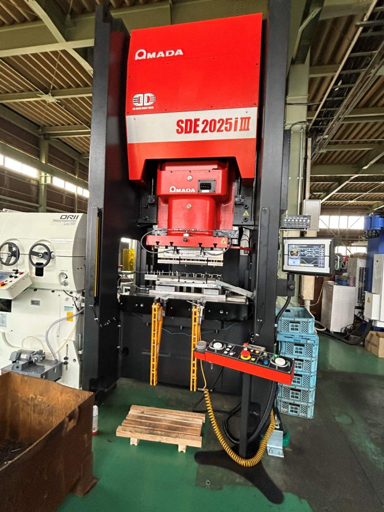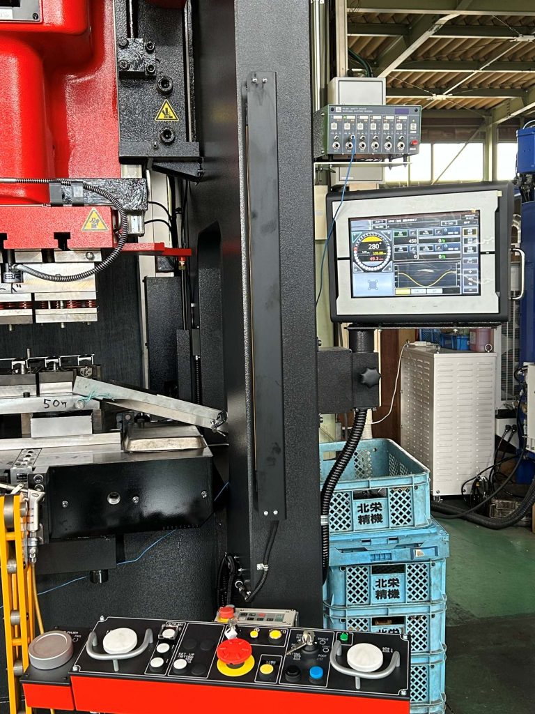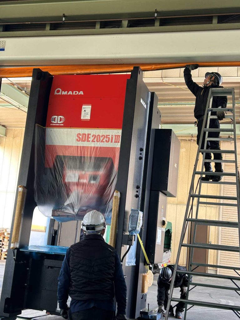 前回のプレス機は150トンだったのですが、今回は200トンプレスにしました。そのため、機械が一回り大きくなり、搬入の際、あわやシャッターに干渉という事態になりました。設置業者さんの機転で何とか工場内に入れることが出来ました。以前のものは天井に張り巡らされたラックに干渉することはなかったのですが、今回はがっつり当たってしまいます。そのため、1メートルほどずらしての設置となりました。