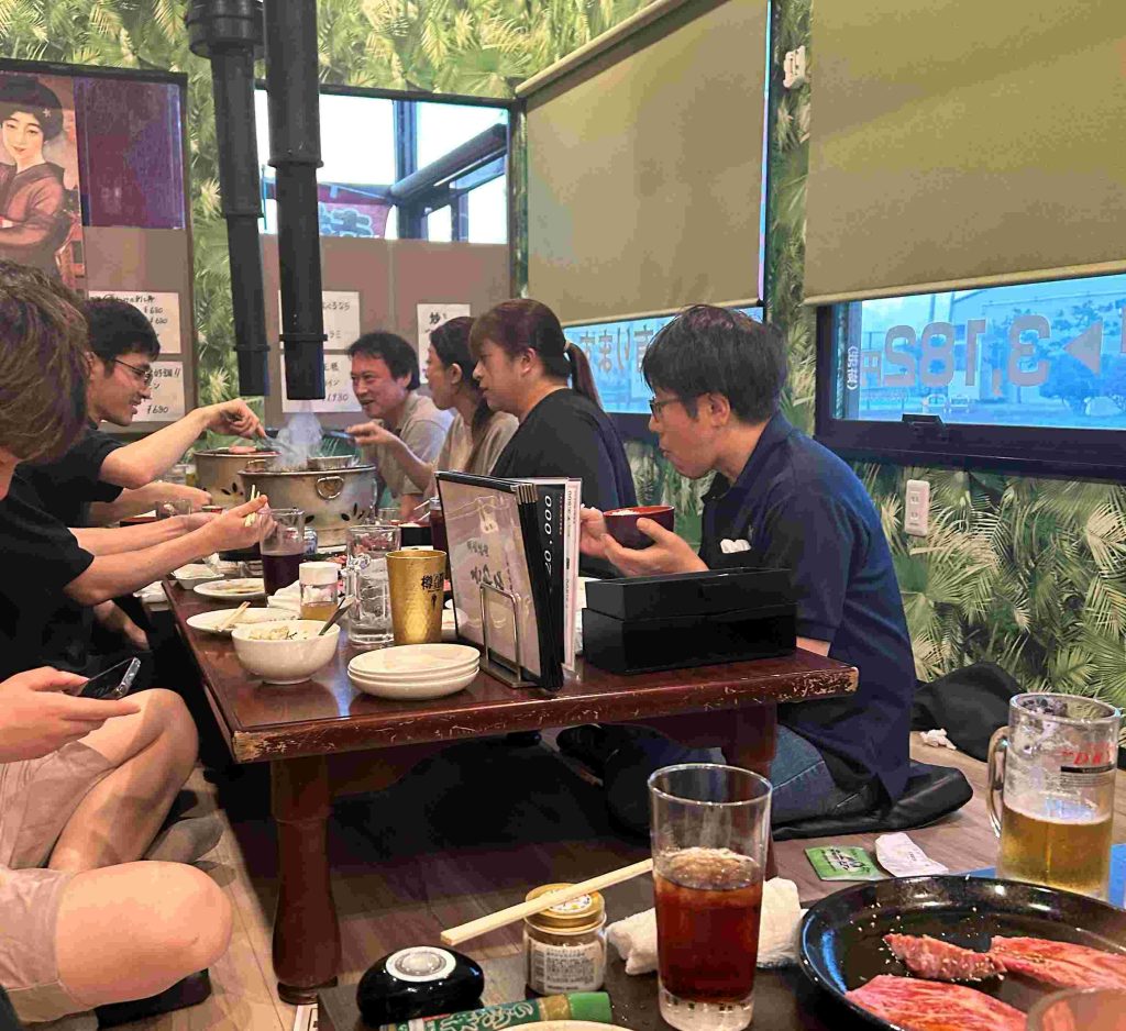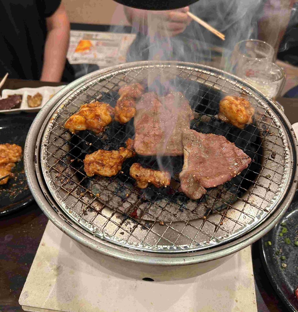七輪なので煙が大量に出ます。真上にセットされたダクトで吸引しますが、肉の脂が落ちて煙が大量発生。