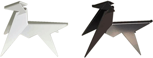 来年の干支・馬をイメージしたオブジェ。金属板を折り曲げることで厚みを出し、自立するように作成しました。CADの縮尺機能を使うことで、大きさのことなる2種類のサイズを作成、親馬・仔馬を表現しました。