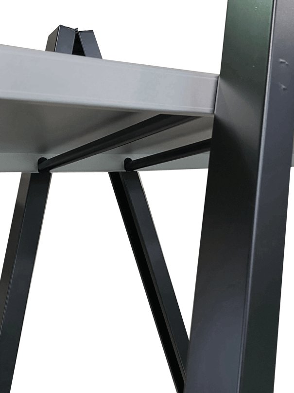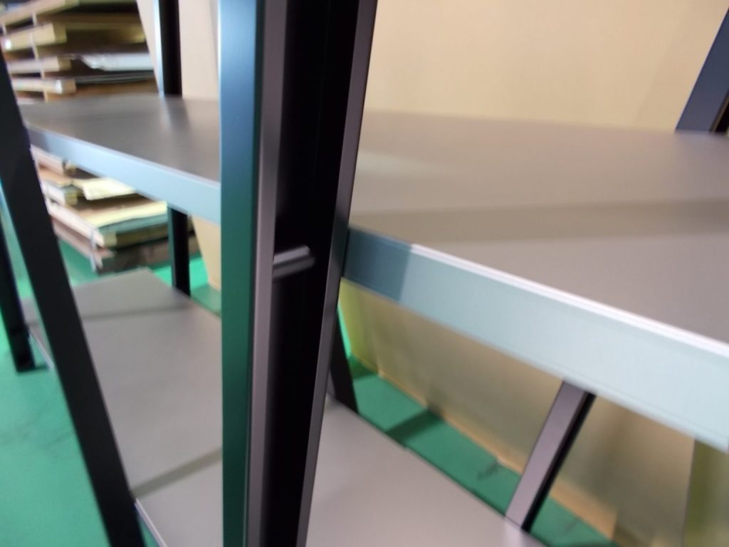 棚部分はアルミ材A5052t1.0を使用しています。アルミ材の切断はファイバーレーザー加工機で行っています。その昔、アルミ材のレーザー切断は、レーザーのビームが材料に乱反射して機械内部まで跳ね返ってくるリスクがある為、敬遠されていました。現在では技術の進歩によりそのようなリスクも軽減されましたが、CO2レーザー加工機で切るより、ファイバーレーザー加工機で切る方が、明らかに切断面・ドロス量の軽減に一日の長があります。