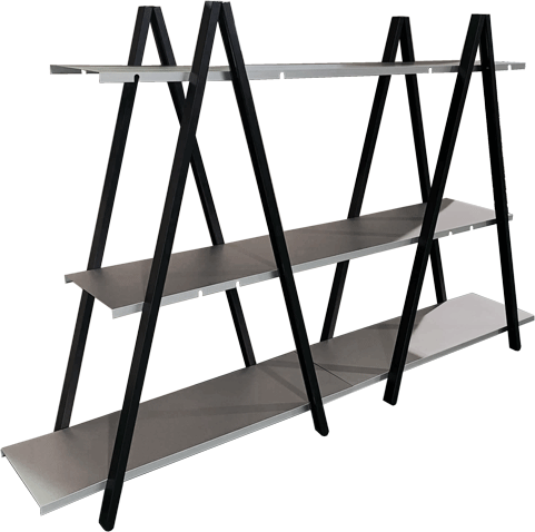 2台の三脚を柱として、アルミ製の棚を3段渡しています。棚の部分にU字型のスリットを入れることで、三脚を固定しています。壁面が見えることで奥行きを感じることが出来ます。脚のパイプ部分に棚のU字型スリットを組み合わせることで組み立てることが出来るため、容易に移設することが出来ます。短期間のイベントにも対応することが出来ます。脚は折り畳み式の為、コンパクトな収納になります。